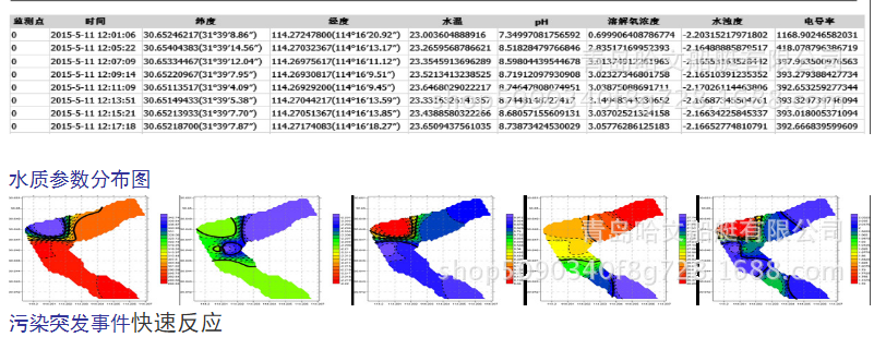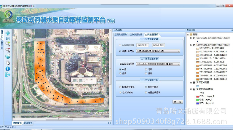 無人船按設置的路線、監測點和采樣點自動進行工作。地面控制基站用軟件實時記錄、存儲監測的具體坐標、數據,繪制監測和采樣報告,并自動生成水質參數分布圖。